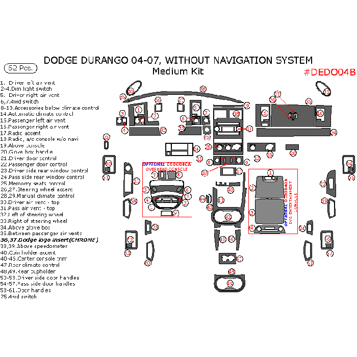 WOW TRIM Dodge Durango 2004-2007, Without Navigation, Medium Kit, 62 Pcs.